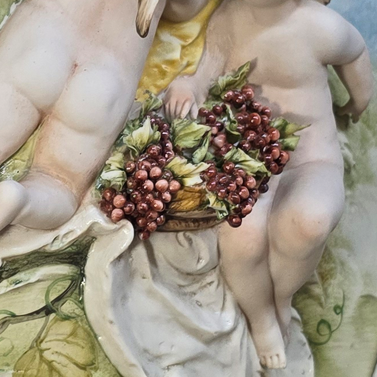 Купить фарфоровый барельеф «Ангелочки с виноградом» Porcellane Principe. Итальянское качество, деревянный багет. Размер 29x43 см.