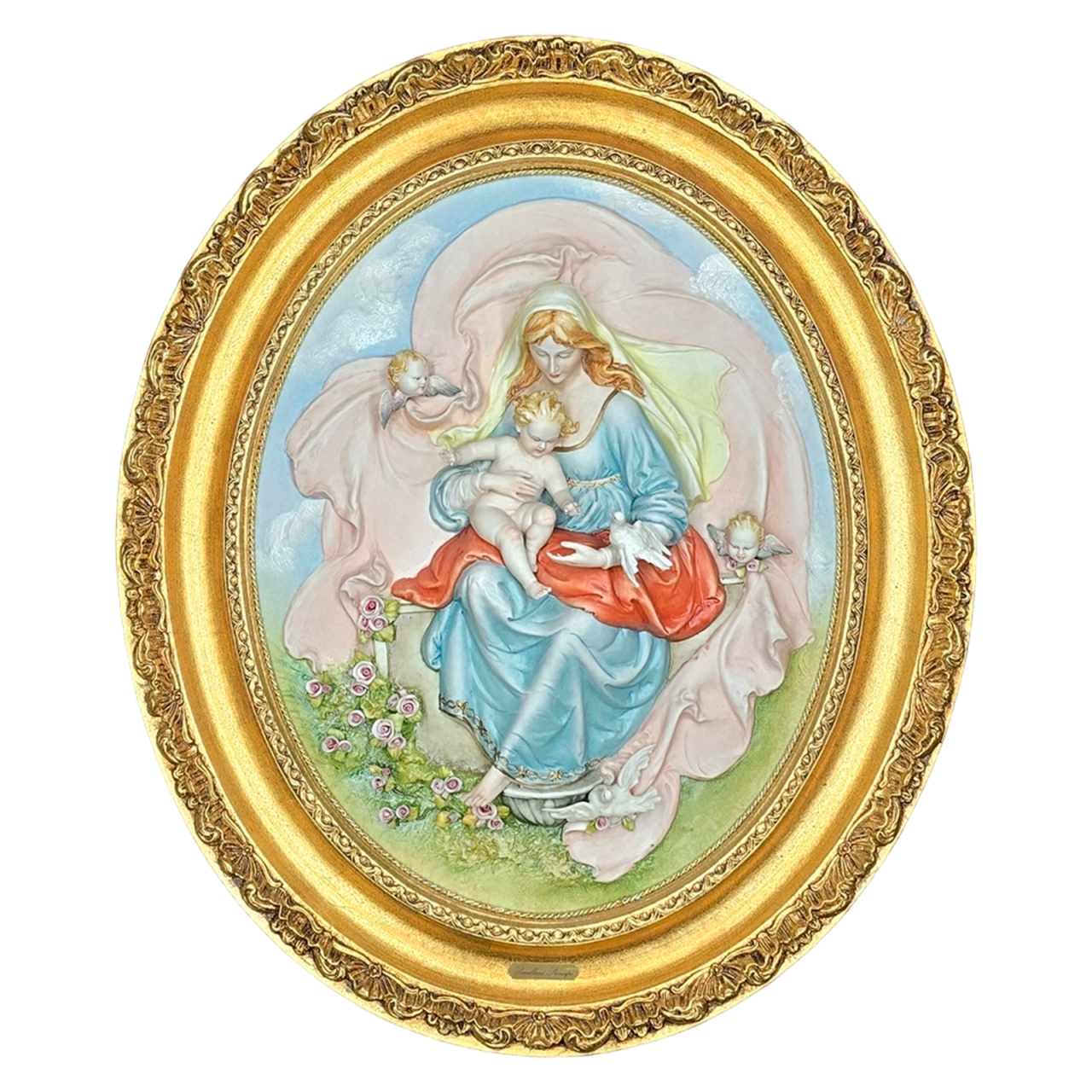 Каждая деталь этого овального барельефа размером 55x65 см свидетельствует о высочайшем уровне ремесла. Филигранная лепка из благородного фарфора создает удивительную игру света и тени, оживляя нежные лики Мадонны и ангелов. Взгляд задерживается на складках одеяний, трепетных крыльях и символе мира — парящих голубях. Изысканную композицию подчеркивает ручная роспись тончайшими кистями, придающая теплоту и глубину каждому образу. Обрамление из золотой патины завершает образ, добавляя камерности и музейного лоска.