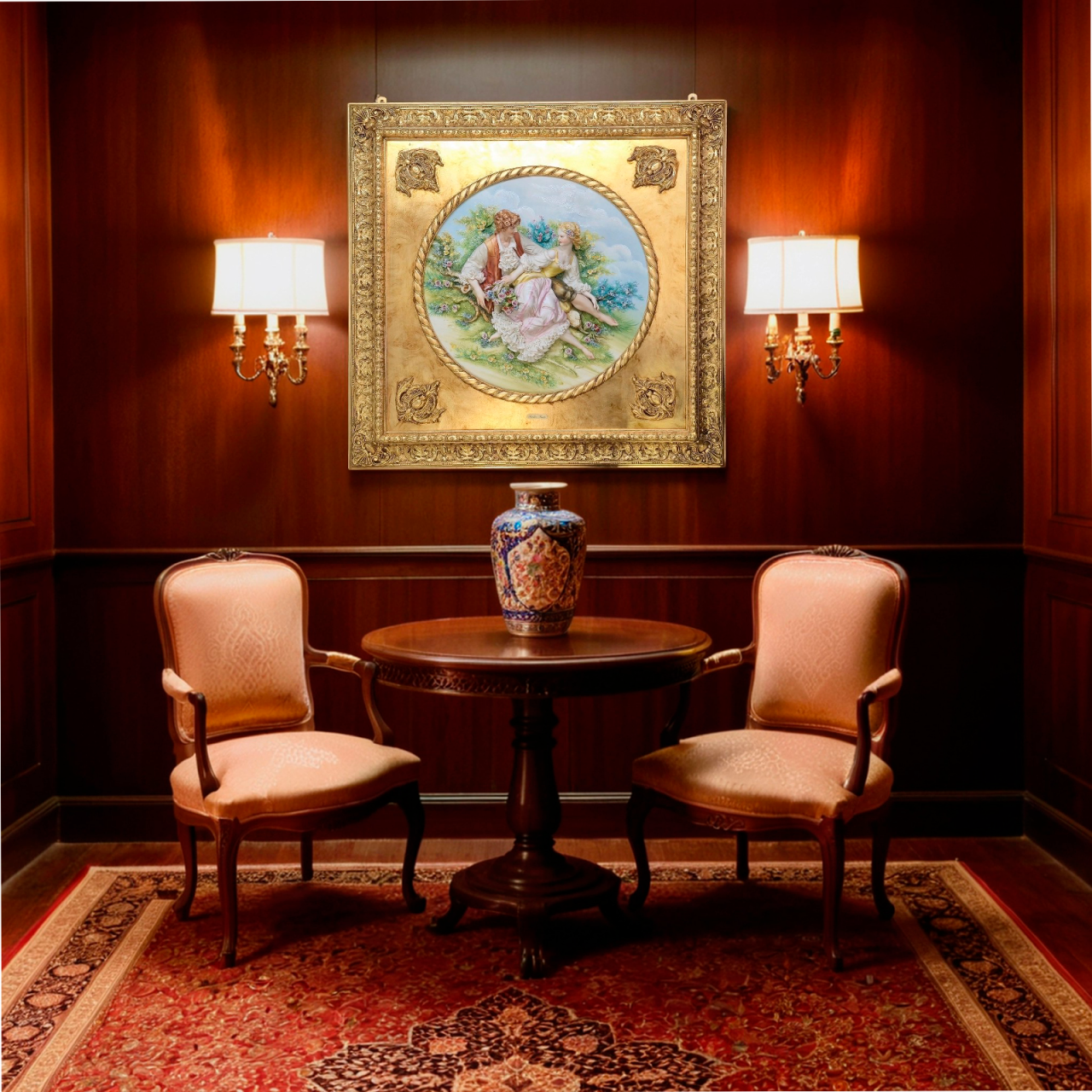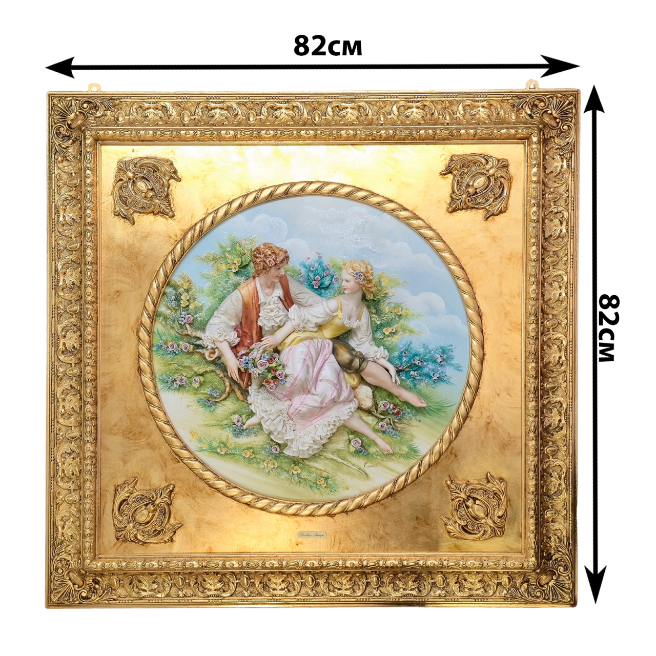 В центре — нежная романтическая сцена: юноша и девушка в изящных исторических костюмах отдыхают среди ароматных цветов и зелени старинного сада. Благодаря тонкой проработке деталей — мягким изгибам фигур, бликам на ткани, легкости жестов — фарфор обретает живое дыхание, а сюжет наполняется лиричностью и гармонией.
