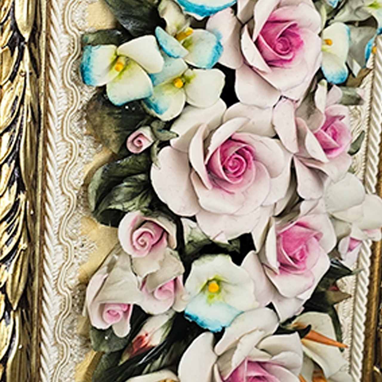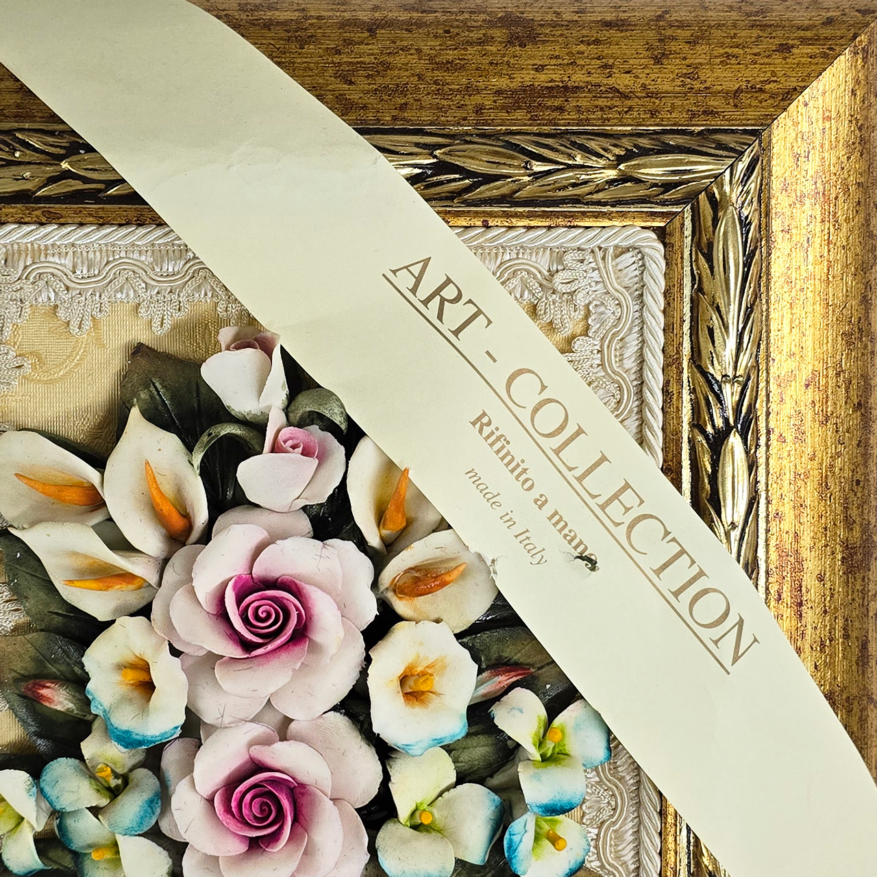 Купить итальянское панно «Букет под стеклом» из керамики. Ручная работа, деревянный багет 59х56 см. Премиальный декор от фабрики Arte Casa для вашего интерьера.