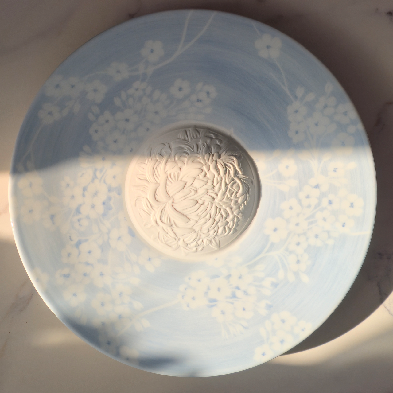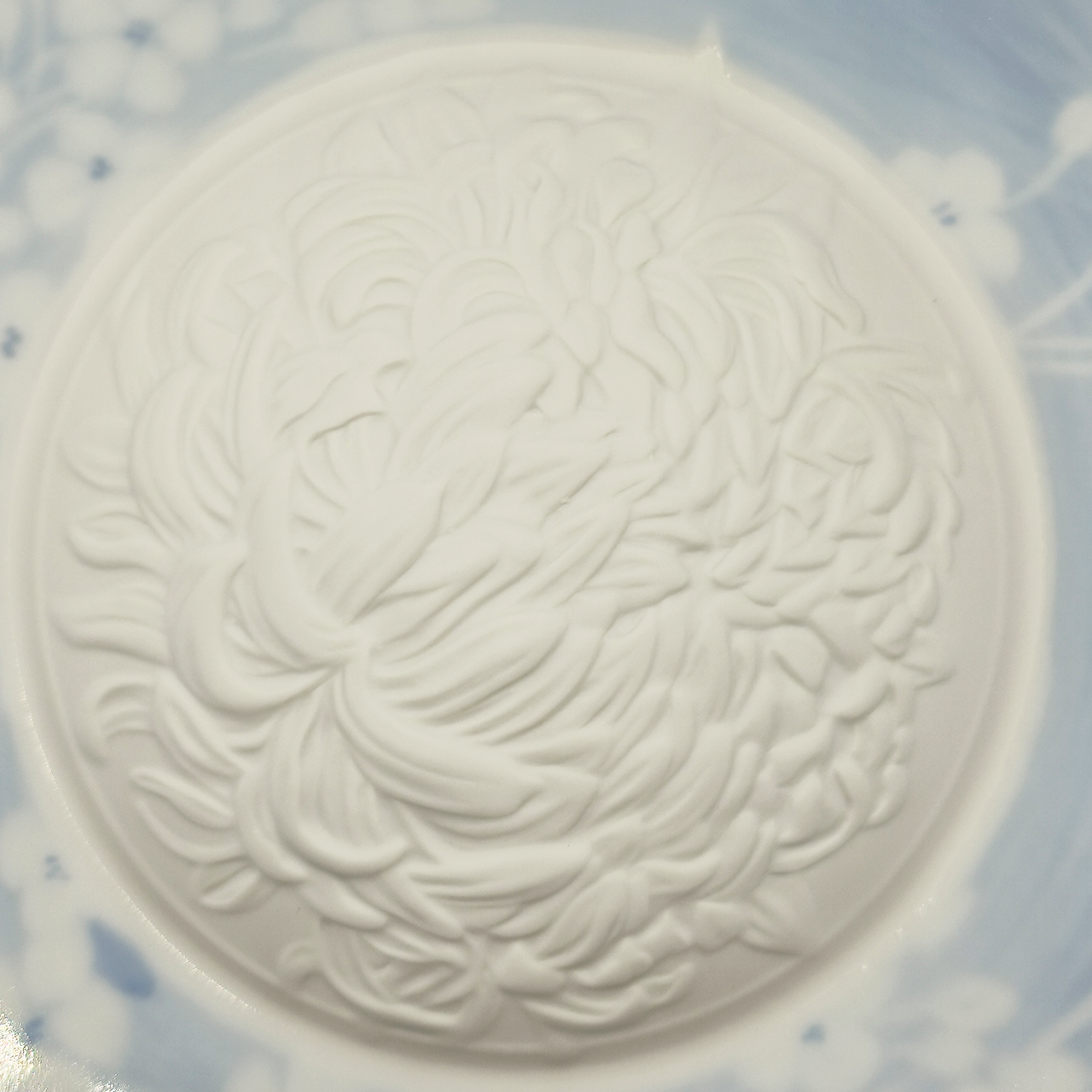 Любой элемент этого блюда — от нежной рельефной середины до росчерков ручной росписи с цветочными мотивами — выполнен с высочайшей точностью и творческим подходом. Это не просто посуда, а пример того, как функциональный предмет становится произведением искусства.