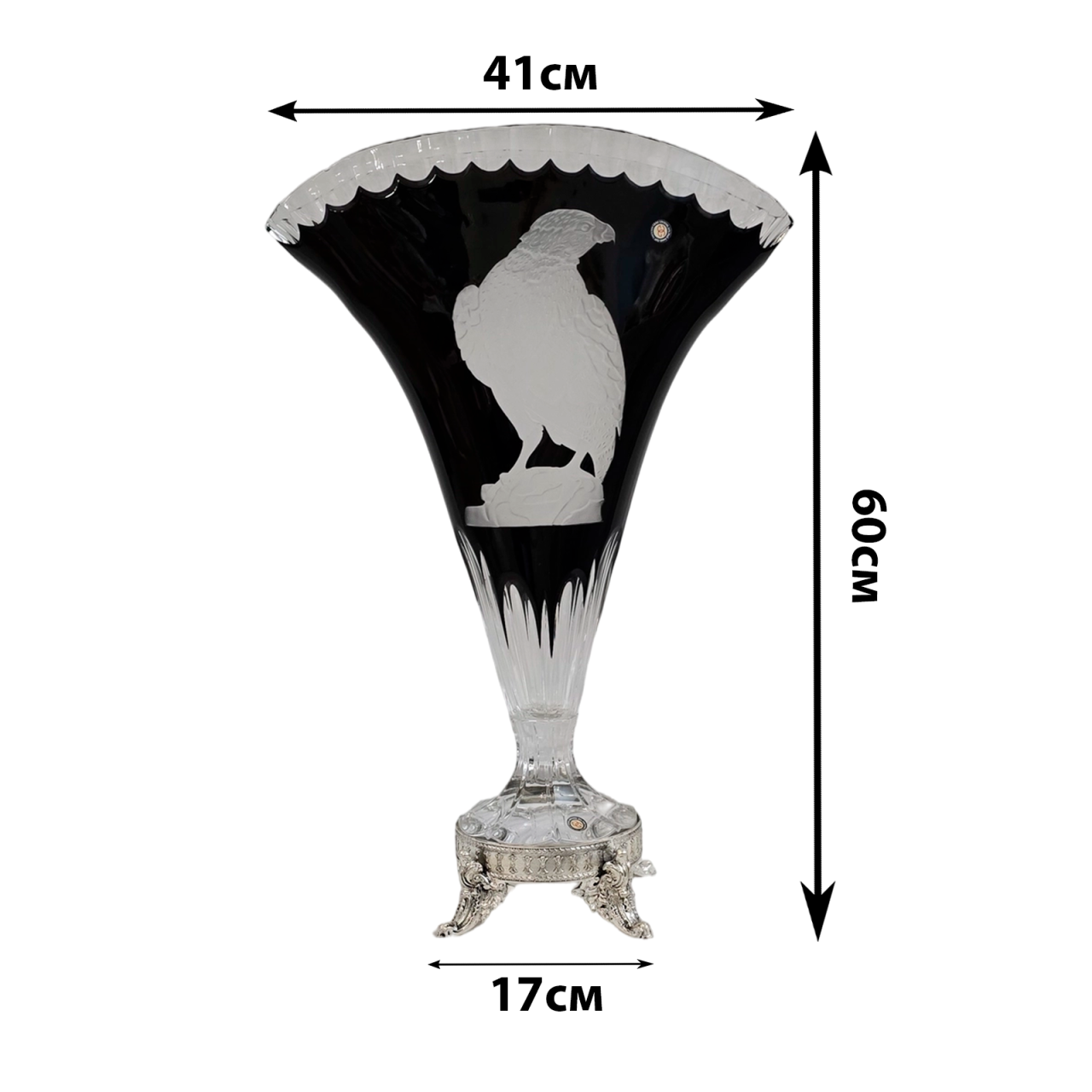 скульптурный шедевр из хрусталя, в котором застыла динамика птичьего полета. Это не просто сосуд, а смелая архитектурная форма от знаменитой итальянской фабрики Gasparri Design, созданная для тех, кто ценит редкое и статусное. Ваза исполнена в уникальной двухслойной технике: кристальная прозрачность толстостенного хрусталя встречается с глубоким, абсолютным черным, создавая волшебную игру света и тени, объем и таинственную глубину. Ваза двухсторонняя: лицевая сторона с ручной гравировкой рисунка Сокола, оборотная сторона - травление, для эстетики и презентации толщины стенок вазы.