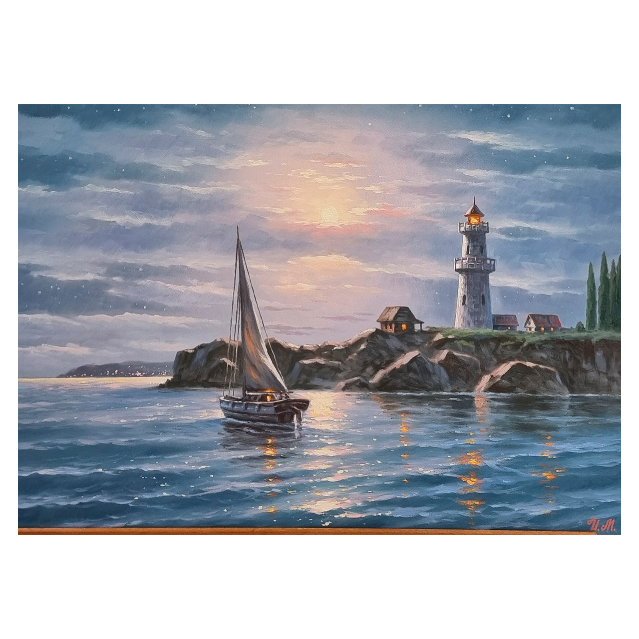 Авторская картина Ильина М.А. переносит зрителя в тихий вечер у моря, где мягкий лунный свет и тёплое сияние маяка отражаются в мерцающей воде. Спокойная гладь залива, парусник у скал и уютные домики на берегу создают атмосферу умиротворения и романтики.