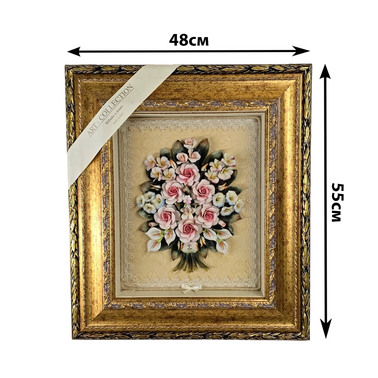 Купить итальянское панно «Букет под стеклом» из керамики. Ручная работа, деревянный багет 59х56 см. Премиальный декор от фабрики Arte Casa для вашего интерьера.