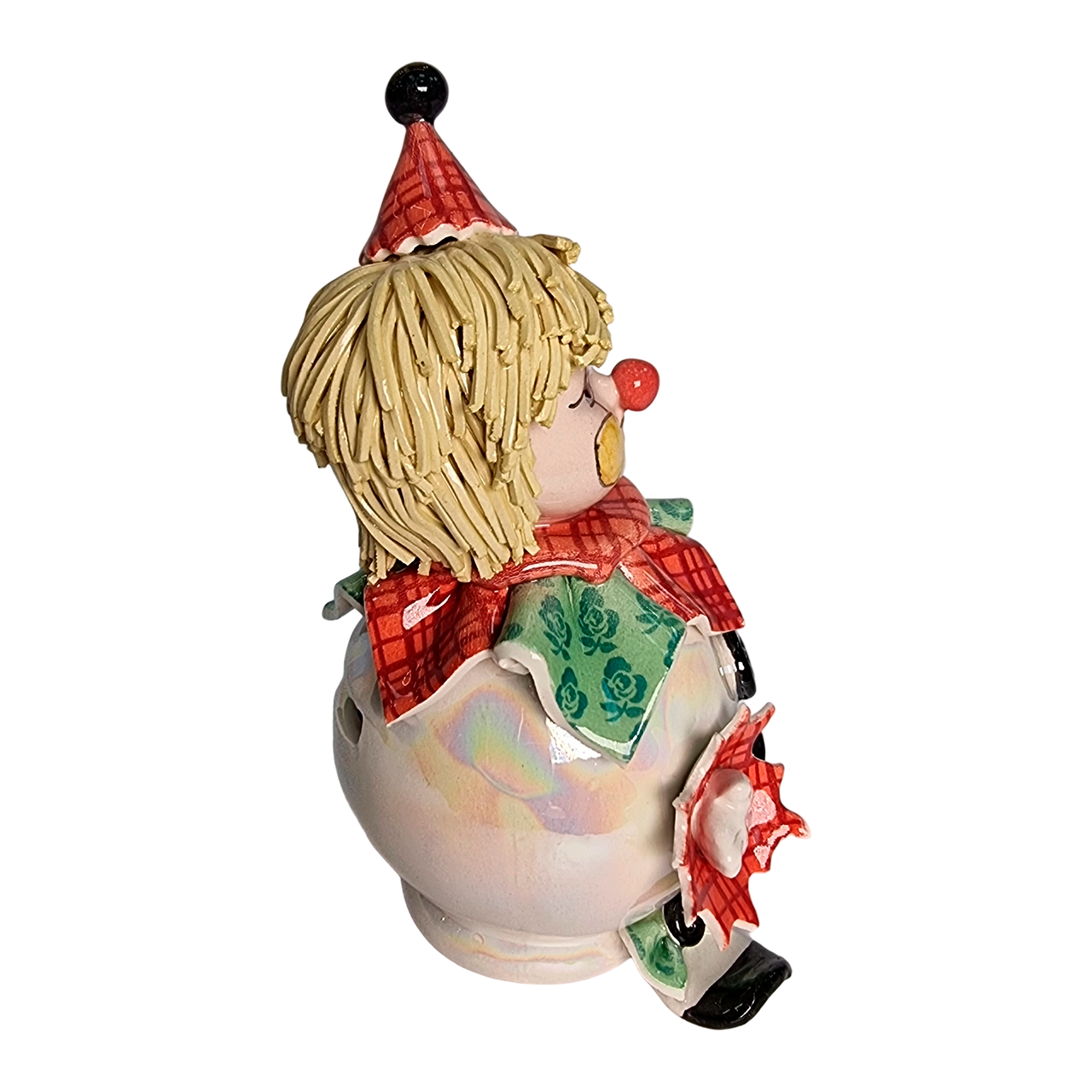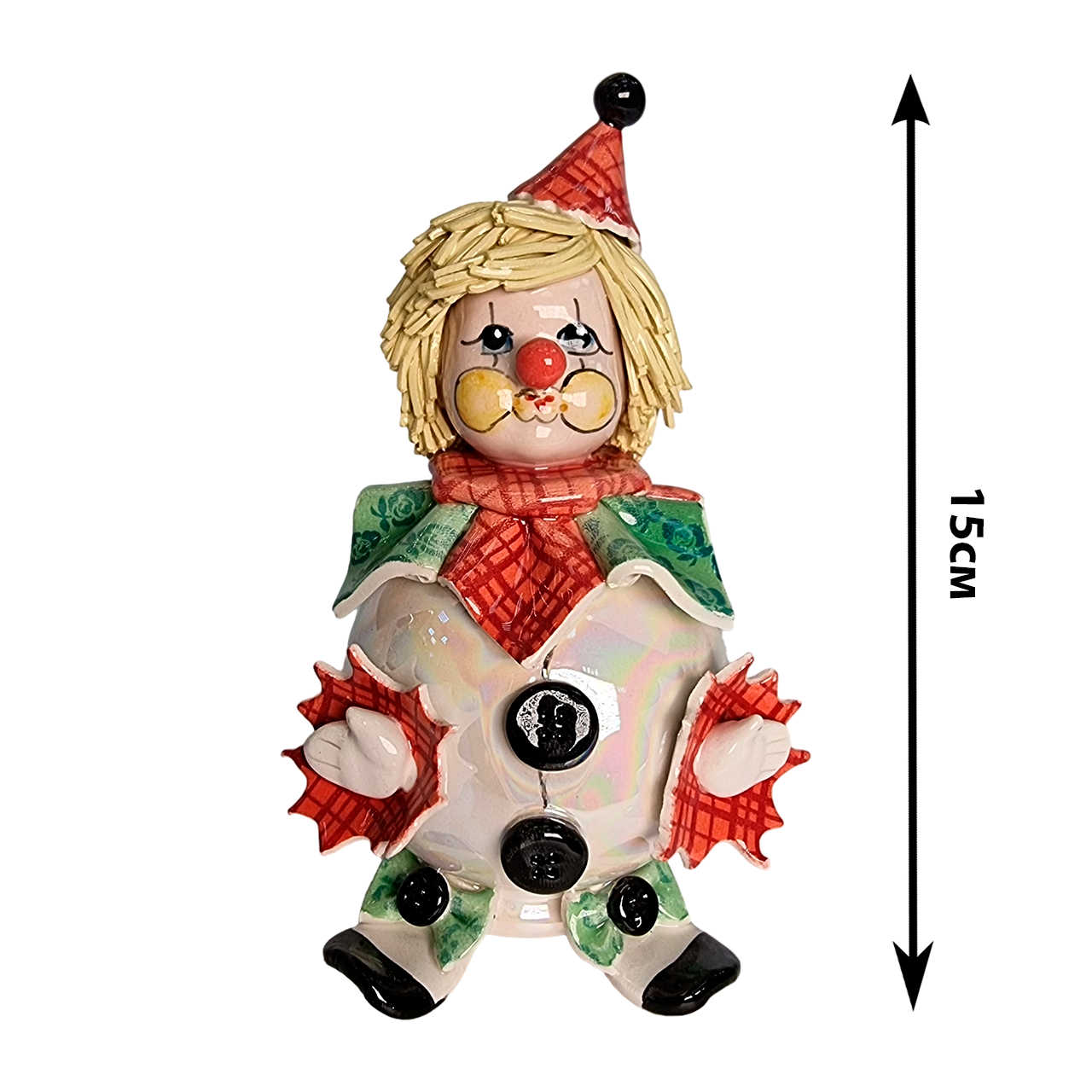 Статуэтка изображает забавного клоуна в ярком красном колпаке. Наряд артиста дополнен сочными зелеными и красными элементами декора, которые выгодно подчеркивают форму и создают праздничное настроение. Несмотря на скромные габариты, эта фигурка обладает мощной положительной энергетикой и точно не затеряется в интерьере.