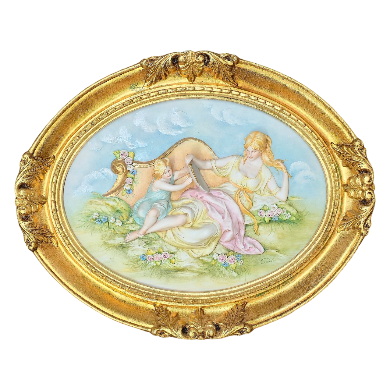 Итальянский фарфоровый барельеф «Мать с ребёнком» в золотом багете. Эксклюзив от фабрики Porcellane Principe. Готовое интерьерное решение. Купить с доставкой.