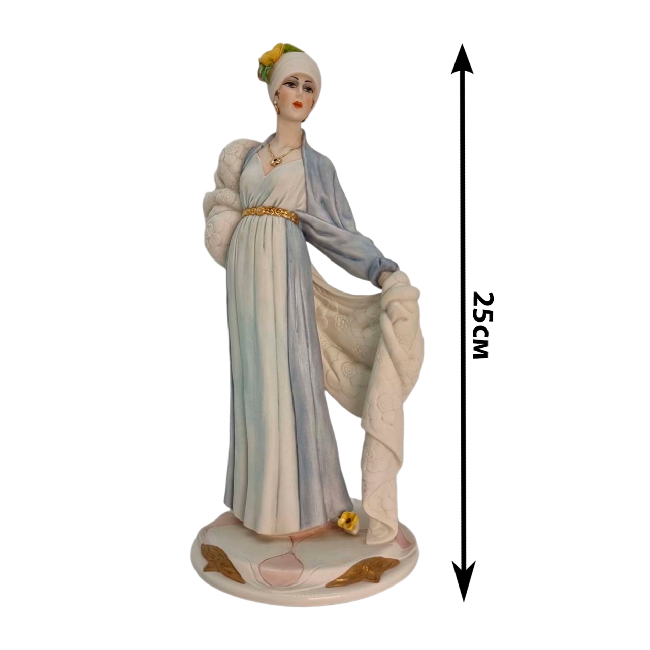 Фигура высотой 25 см выполнена фабрикой Elite&Fabris (Турин, Италия), известной своим высококачественным фарфором и вниманием к деталям. Полихромная роспись тщательно проработана: от нежных пастельных оттенков платья до ярких акцентов шали и деликатной прорисовки лица.