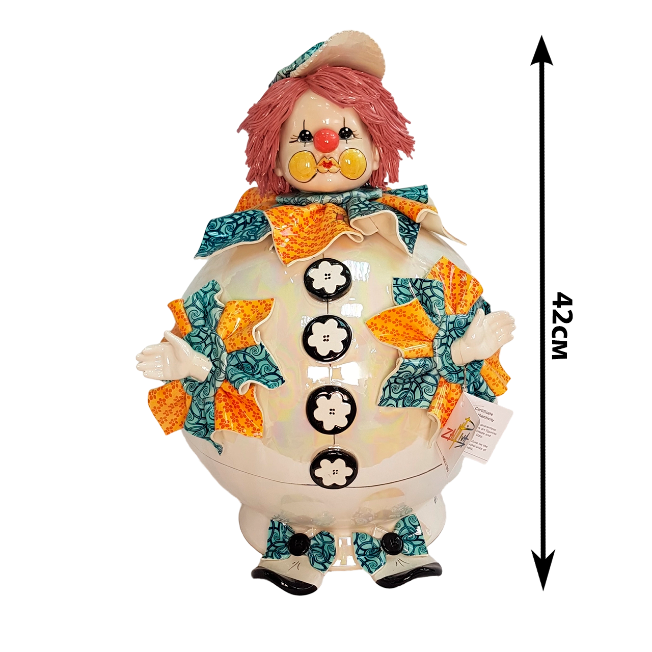 Благодаря высоте 42 см и диаметру 29 см, этот клоун становится заметным акцентом в любом помещении — будь то гостиная, прихожая или детская комната. Фигурка расписана вручную мастерами Zampiva, поэтому каждый цветовой переход уникален. На теле фигурки стоит подпись Lino Zampiva. Традиционная итальянская керамика высшего качества, покрытая глазурью, создает эффект сияния и визуальной глубины.