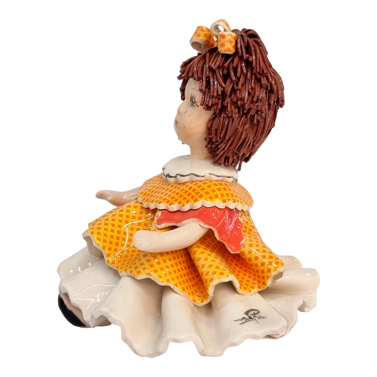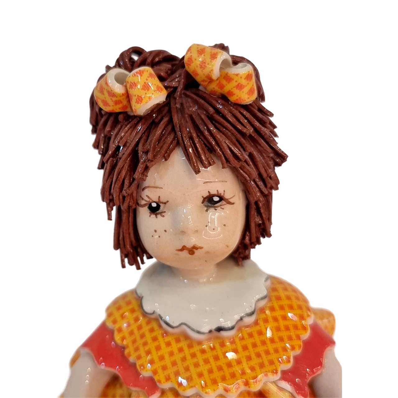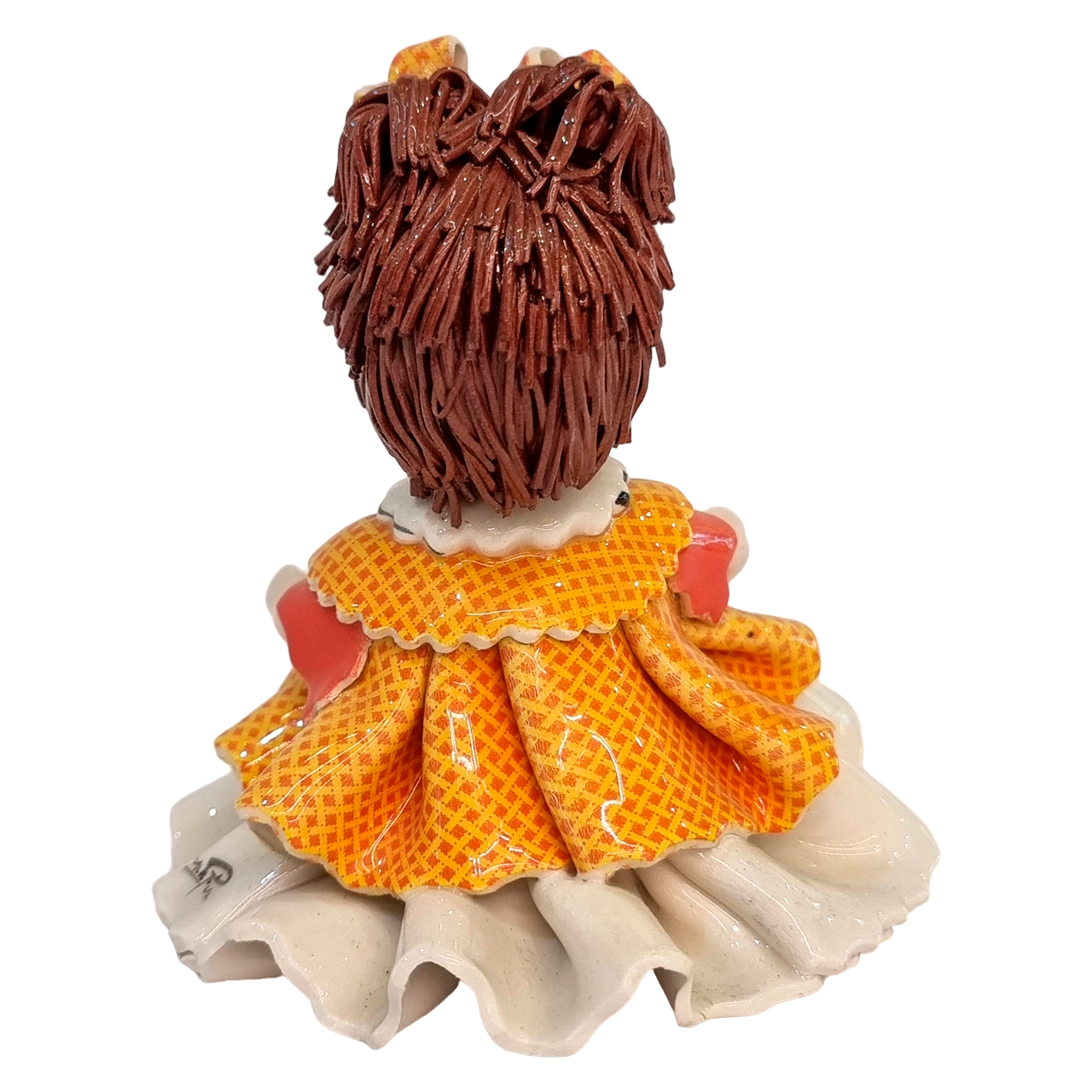 Очаровательная интерьерная статуэтка от итальянской фабрики Zampiva. Модель выполнена вручную из высококачественной керамики, что придает ей неповторимый шарм и уникальность. Сидящая кукла с выразительными темными волосами одета в яркое оранжевое платье. Благодаря компактному размеру (всего 9 см), фигурка станет стильным акцентом на рабочем столе, полке или в серванте, не занимая много места.
