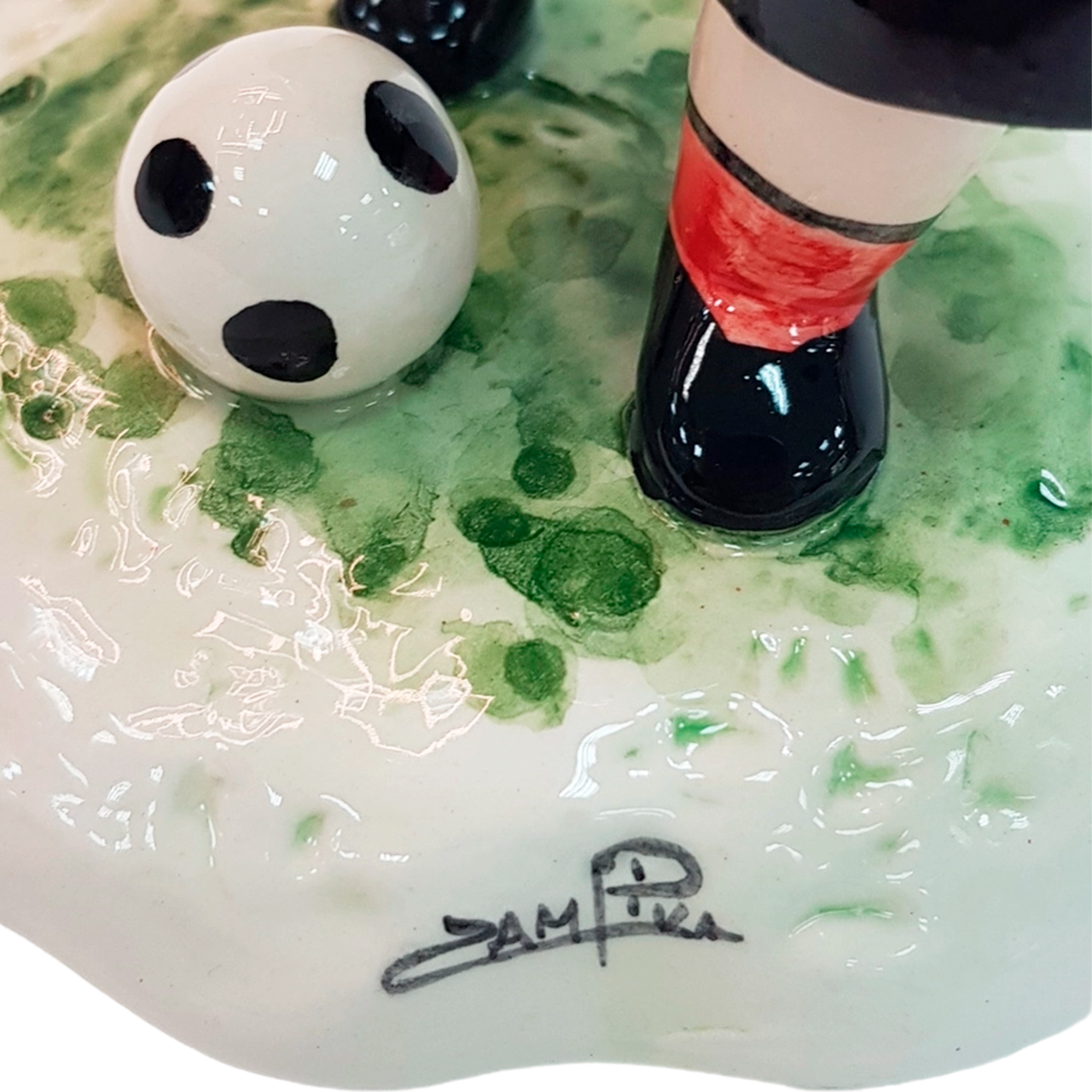 Итальянская статуэтка «Футболист» (красный/черный, 18 см) от Zampiva. Ручная работа, веселая керамика. Авторский стиль Lino Zampiva. Купить оригинальный подарок для болельщика с доставкой по РФ.