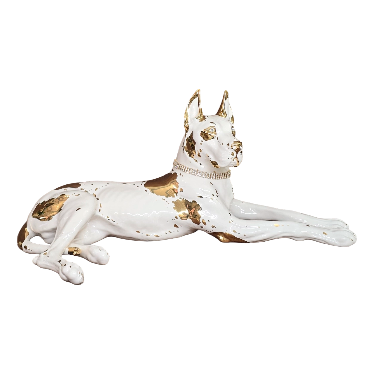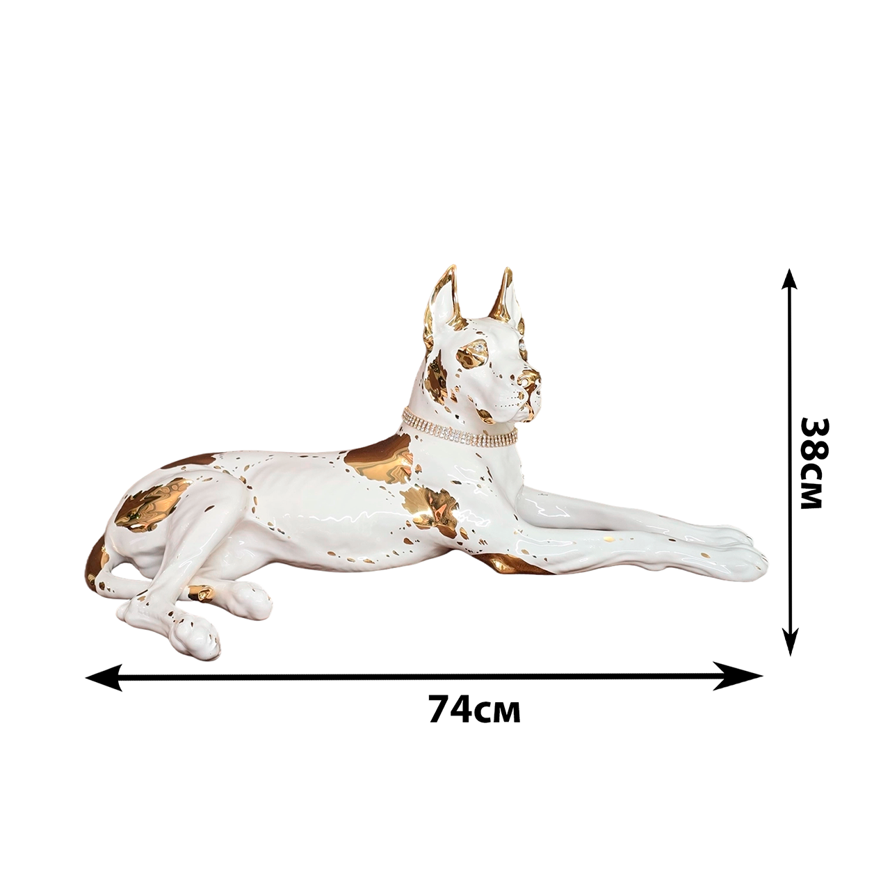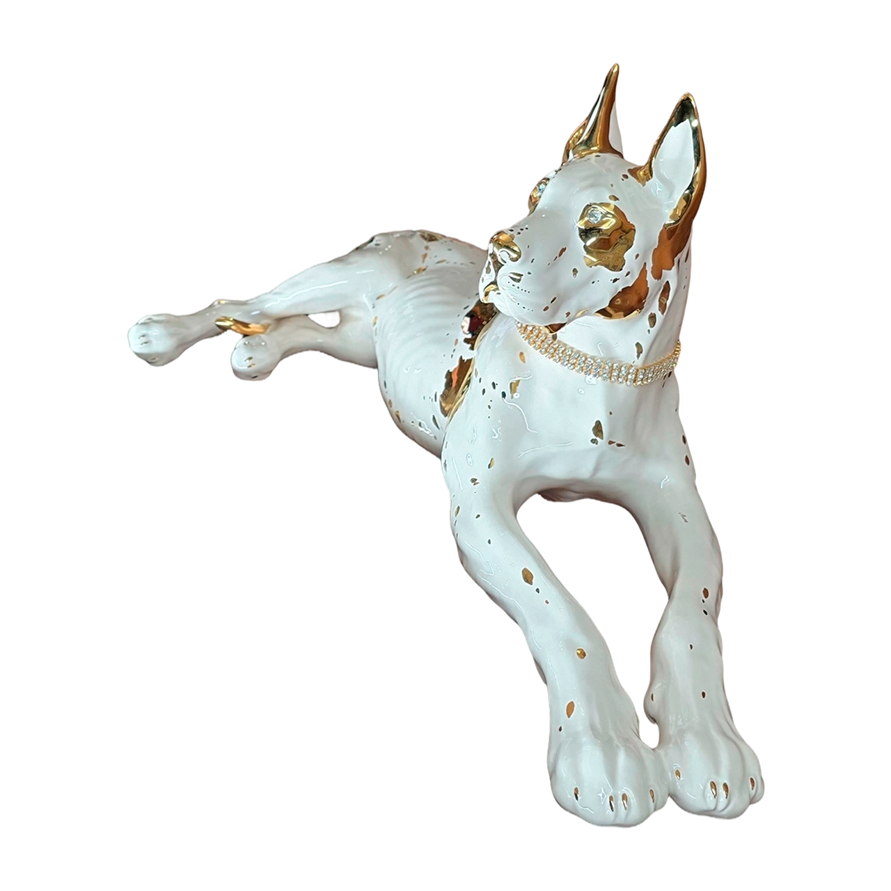 Изысканный оттенок слоновой кости, теплый и благородный, покрывает всю поверхность керамической скульптуры. Искусная золотая отделка (золочение) сияет на изгибах тела, очерчивая мощные плечи, изящные лапы и выразительную морду, придавая образу королевское величие. Каждая деталь — от текстуры тела до спокойного взгляда — проработана с любовью и мастерством. Особенно дорого смотрится дог со своим ошейником из страз высокого качества.