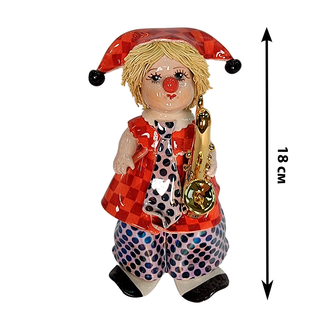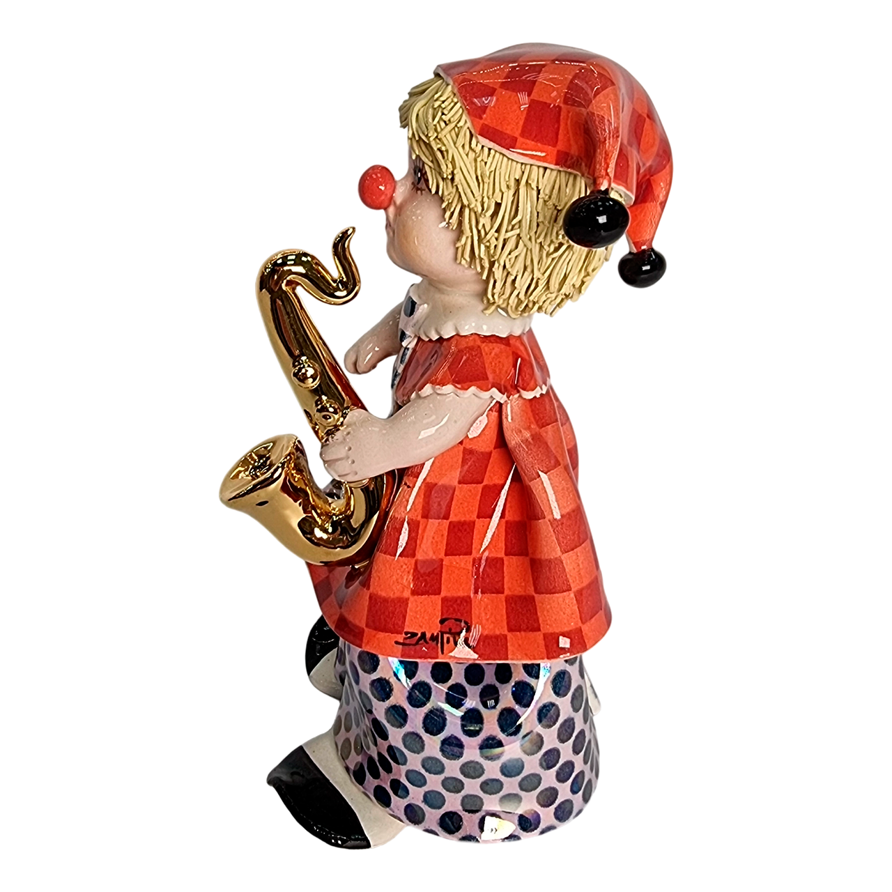 Изысканная статуэтка «Маленький клоун с саксофоном» (h 18 см) из Италии. Керамика ручной работы от фабрики Zampiva. Купить оригинальный подарок музыканту, ребёнку или в коллекцию с доставкой по РФ.