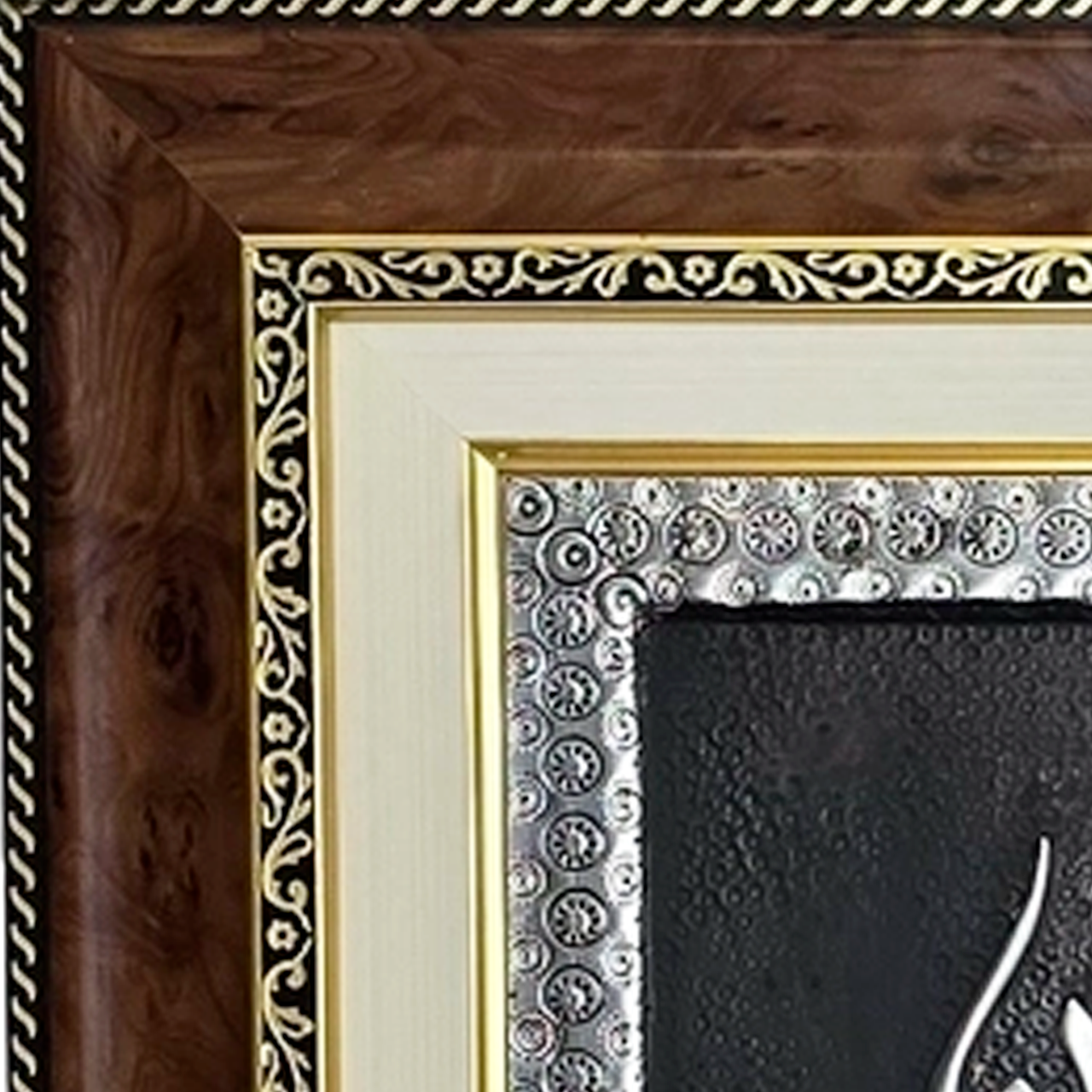 Текст Суры выглядит объемным и фактурным. Благородный серебристый оттенок мягко отражает свет, а затемненные (черненые) участки добавляют глубину и контраст. Это делает панно заметным даже на светлых стенах.