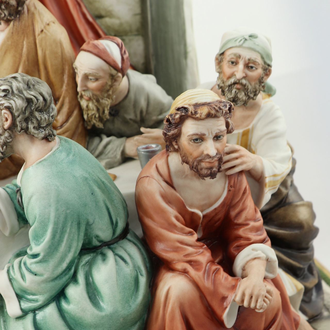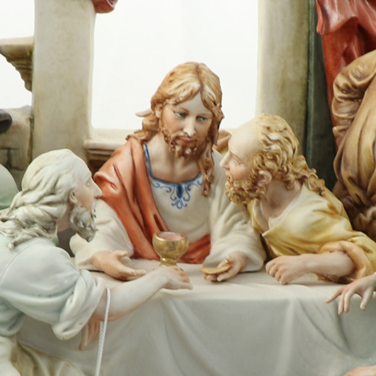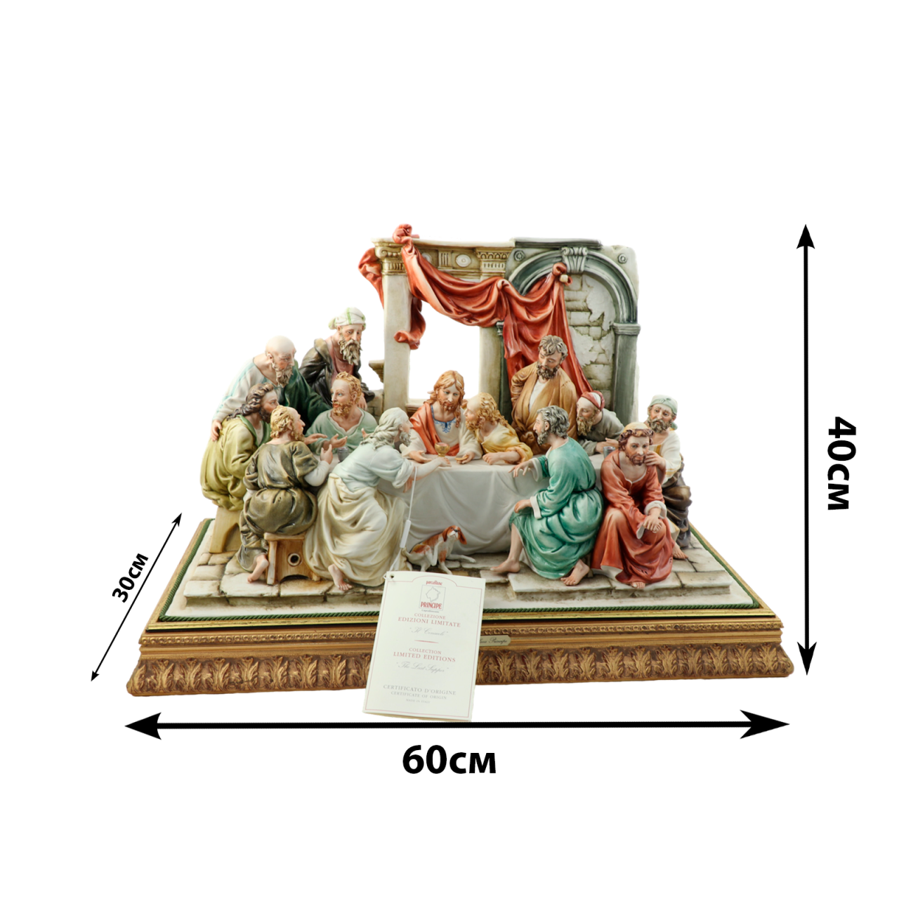 Многофигурная композиция поражает филигранной детализацией: каждая фигура апостола, складки одежд и элементы интерьера проработаны вручную. Богатая полихромная роспись оживляет библейский сюжет, наполняя его драматизмом. Впечатляющий формат (L60xh40 см) делает статуэтку центральным акцентом в классическом интерьере, символом безупречного вкуса.